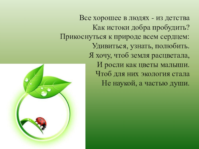 Как истоки добра пробудить? Прикоснуться к природе всем сердцем: Удивиться, узнать, полюбить. Я хочу, чтоб земля расцветала, И росли как цветы малыши. Чтоб для них экология стала Не наукой, а частью души.