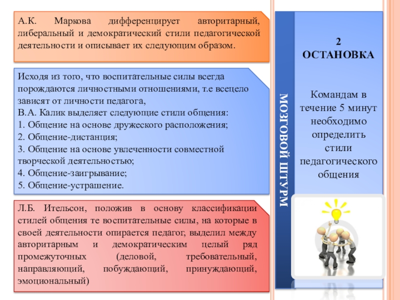 Л.Б. Ительсон, положив в основу классификации стилей общения те воспитательные силы, на которые в своей деятельности опирается педагог, выделил между авторитарным и демократическим целый ряд промежуточных (деловой, требовательный, направляющий, побуждающий, принуждающий, эмоциональный)