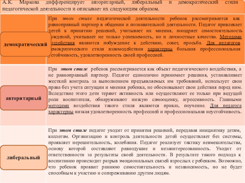 А.К. Маркова дифференцирует авторитарный, либеральный и демократический стили педагогической деятельности и описывает их следующим образом.