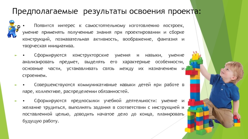 • Появится интерес к самостоятельному изготовлению построек, умение применять