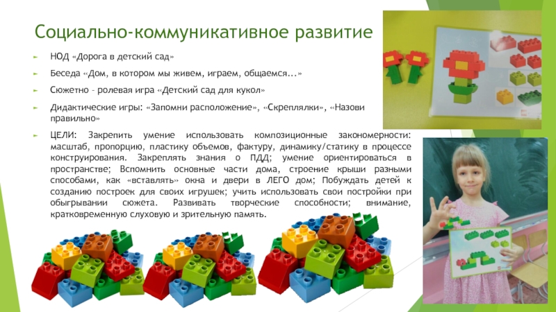 ЦЕЛИ: Закрепить умение использовать композиционные закономерности: масштаб, пропорцию, пластику объемов, фактуру, динамику/статику в процессе конструирования. Закреплять знания о ПДД; умение ориентироваться в пространстве; Вспомнить основные части дома, строение крыши разными способами, как «вставлять» окна и двери в ЛЕГО дом; Побуждать детей к созданию построек для своих игрушек; учить использовать свои постройки при обыгрывании сюжета. Развивать творческие способности; внимание, кратковременную слуховую и зрительную память.