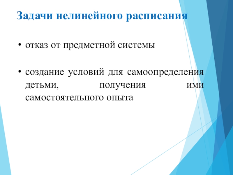 Задачи нелинейного расписанияотказ от предметной системысоздание условий для самоопределения детьми, получения ими самостоятельного опыта