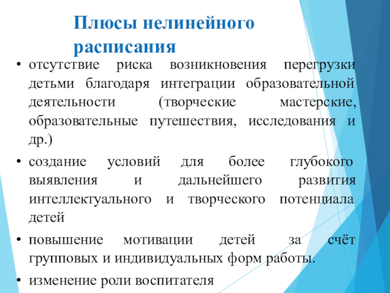 Плюсы нелинейного расписанияотсутствие риска возникновения перегрузки детьми благодаря интеграции образовательной деятельности (творческие мастерские, образовательные путешествия, исследования и