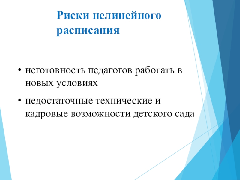 Риски нелинейного расписаниянеготовность педагогов работать в новых условияхнедостаточные технические и кадровые возможности детского сада