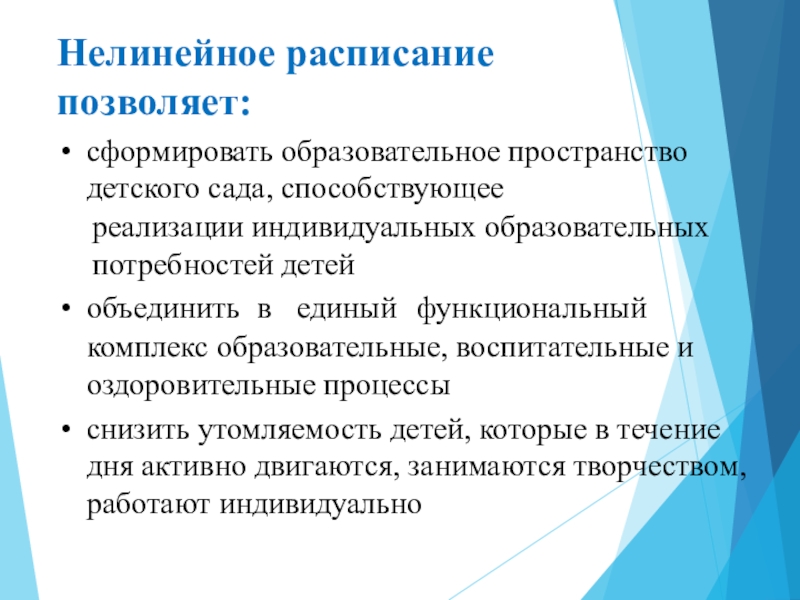 Нелинейное расписание позволяет:сформировать образовательное пространство детского сада, способствующеереализации индивидуальных образовательных потребностей детейобъединить	в	единый	функциональный	комплекс	образовательные, воспитательные и оздоровительные процессыснизить утомляемость