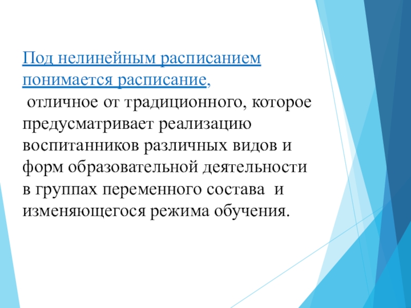 Под нелинейным расписанием понимается расписание, отличное от традиционного, которое предусматривает реализацию воспитанников различных видов и форм образовательной деятельности в группах переменного состава и изменяющегося режима обучения.