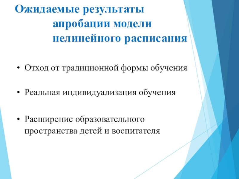 Ожидаемые результаты апробации модели нелинейного расписанияОтход от традиционной формы обученияРеальная индивидуализация обученияРасширение	образовательного	пространства детей и воспитателя
