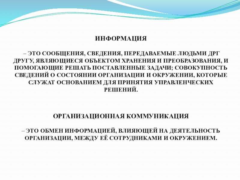 – ЭТО ОБМЕН ИНФОРМАЦИЕЙ, ВЛИЯЮЩЕЙ НА ДЕЯТЕЛЬНОСТЬ ОРГАНИЗАЦИИ, МЕЖДУ ЕЁ СОТРУДНИКАМИ И ОКРУЖЕНИЕМ.