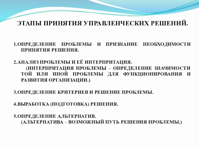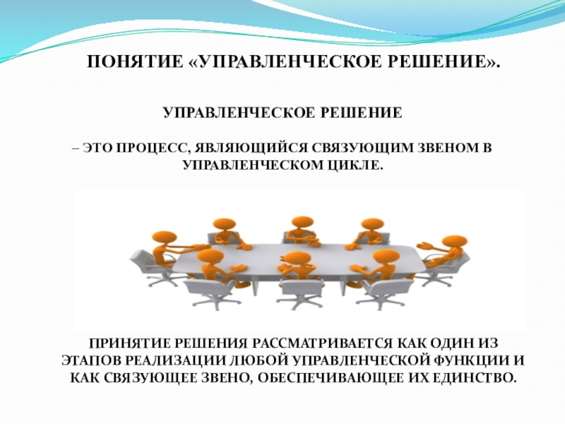 ПРИНЯТИЕ РЕШЕНИЯ РАССМАТРИВАЕТСЯ КАК ОДИН ИЗ ЭТАПОВ РЕАЛИЗАЦИИ ЛЮБОЙ УПРАВЛЕНЧЕСКОЙ ФУНКЦИИ И КАК СВЯЗУЮЩЕЕ ЗВЕНО, ОБЕСПЕЧИВАЮЩЕЕ ИХ ЕДИНСТВО.