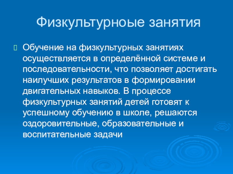 что позволяет достигать наилучших результатов в формировании двигательных навыков. В процессе физкультурных занятий детей готовят к успешному обучению в школе, решаются оздоровительные, образовательные и воспитательные задачи
