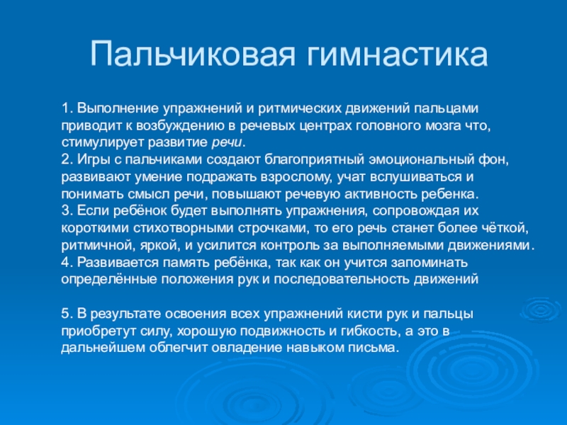 1. Выполнение упражнений и ритмических движений пальцами приводит к возбуждению