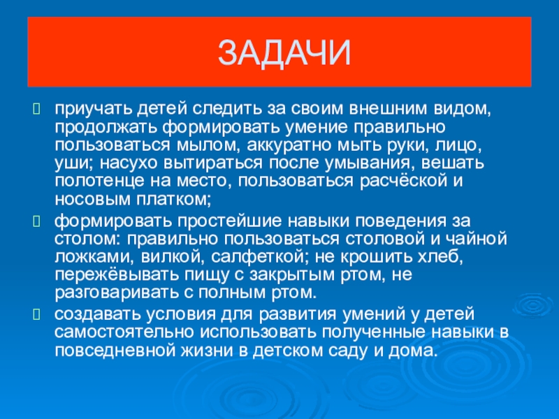 правильно пользоваться мылом, аккуратно мыть руки, лицо, уши; насухо вытираться после умывания, вешать полотенце на место, пользоваться расчёской и носовым платком;