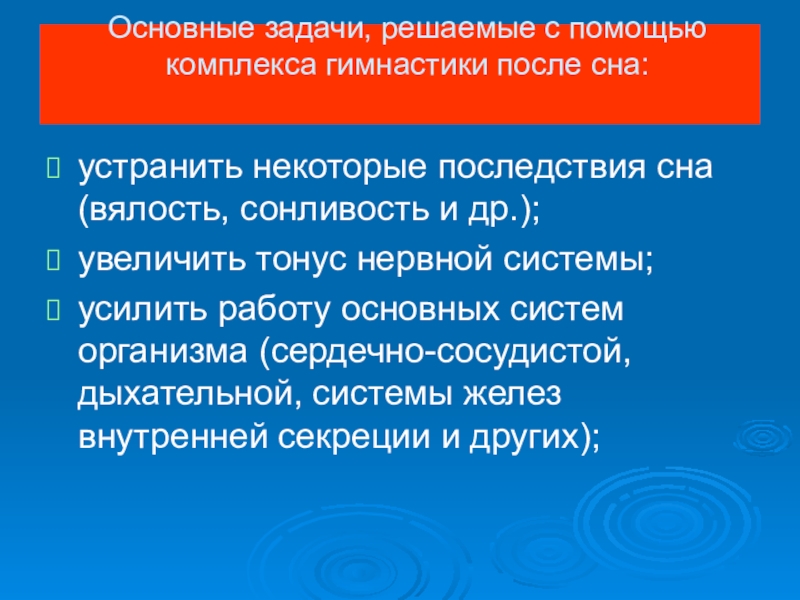 Слайд 25Основные задачи, решаемые с помощью комплекса гимнастики после сна: