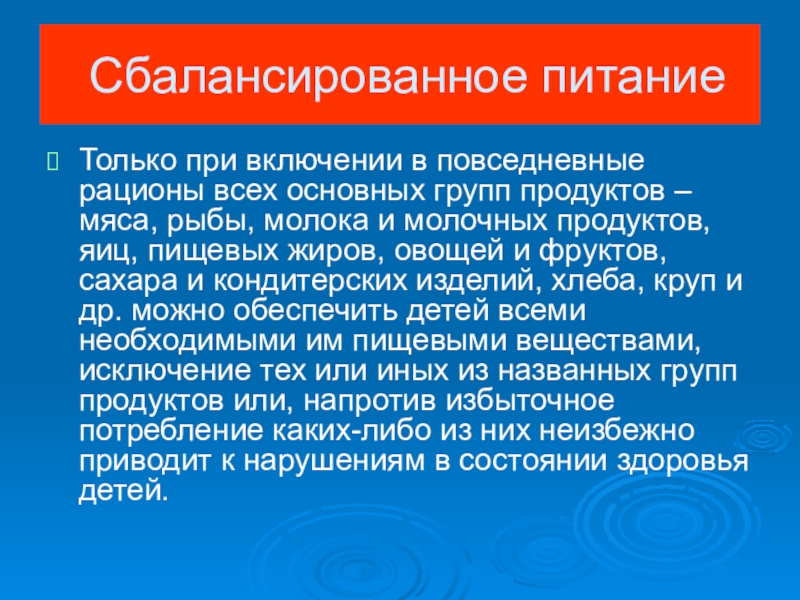 – мяса, рыбы, молока и молочных продуктов, яиц, пищевых жиров, овощей и фруктов, сахара и кондитерских изделий, хлеба, круп и др. можно обеспечить детей всеми необходимыми им пищевыми веществами, исключение тех или иных из названных групп продуктов или, напротив избыточное потребление каких-либо из них неизбежно приводит к нарушениям в состоянии здоровья детей.
