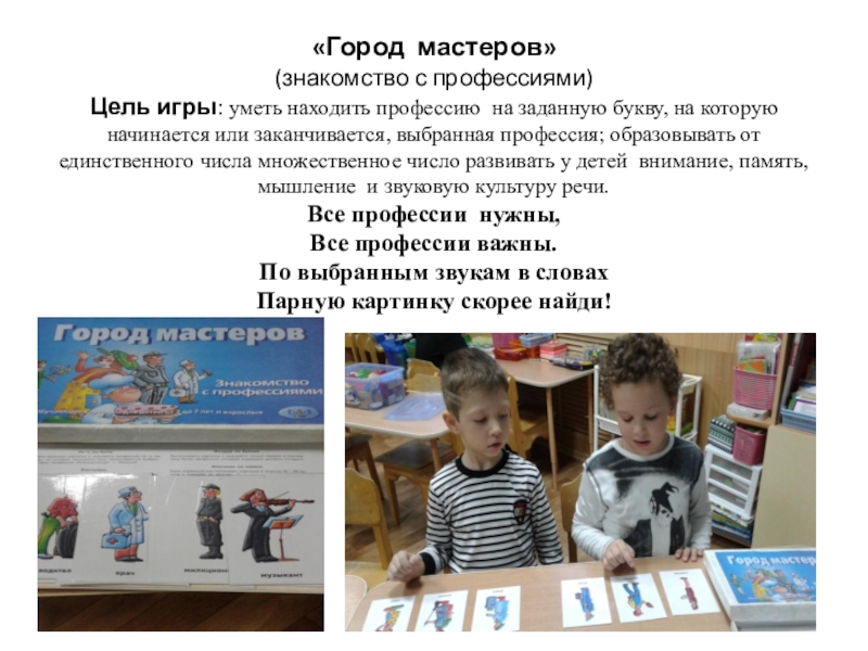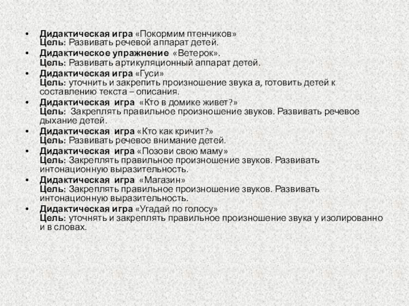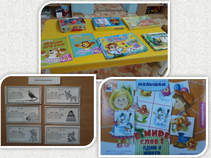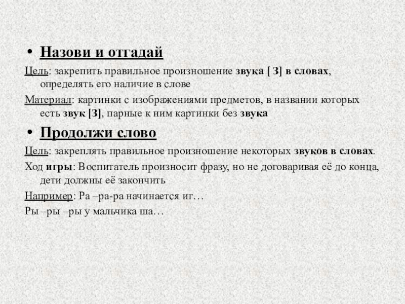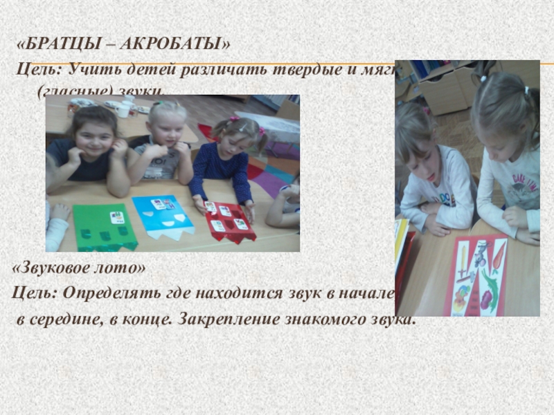 «Что бывает?», игра «Продолжи слово» (в кругу с мячом), игра «Найди пару», игра «Назови ударный звук» (в кругу с мячом), игра «Назови слово» и другие игры и упражнения.