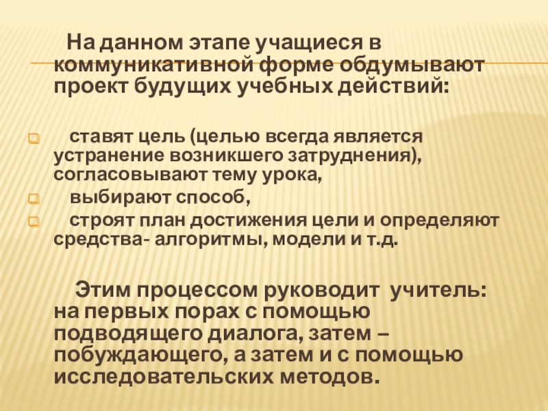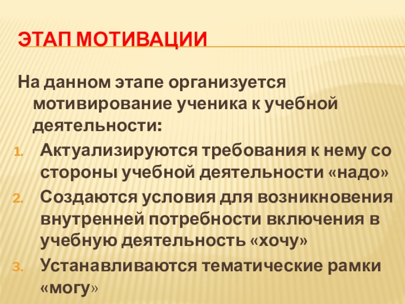 На данном этапе организуется мотивирование ученика к учебной деятельности: