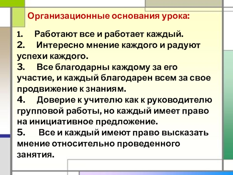 4. Доверие к учителю как к руководителю групповой работы, но каждый имеет право на инициативное предложение.