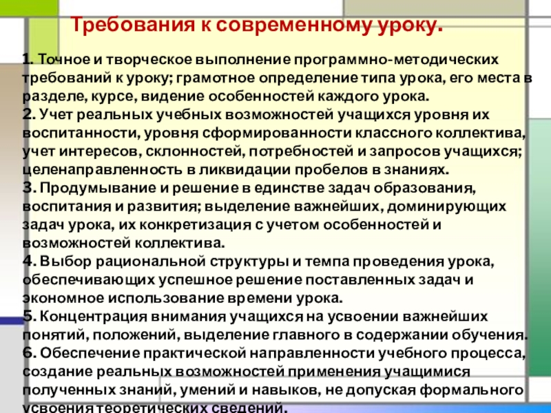 2. Учет реальных учебных возможностей учащихся уровня их воспитанности, уровня сформированности классного коллектива, учет интересов, склонностей, потребностей и запросов учащихся; целенаправленность в ликвидации пробелов в знаниях.