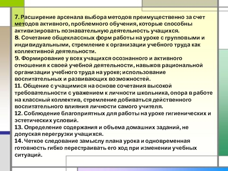 12. Соблюдение благоприятных для работы на уроке гигиенических и эстетических условий.