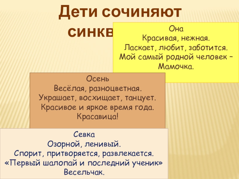Составление синквейна – индивидуальная работа, но для начала нужно составить его всем классом. Можно включить синквейн и в домашнее задание, тогда при проверке учитель оценит, насколько верно поняли учащиеся смысл изученного материала.