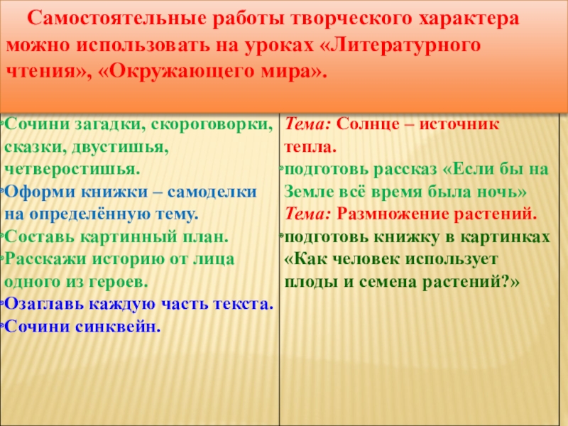 Слайд 51Самостоятельные работы творческого характера можно использовать на уроках «Литературного чтения», «Окружающего