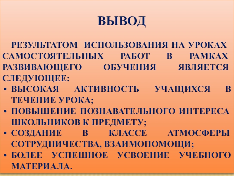 Результатом использования на уроках самостоятельных работ в рамках развивающего обучения является