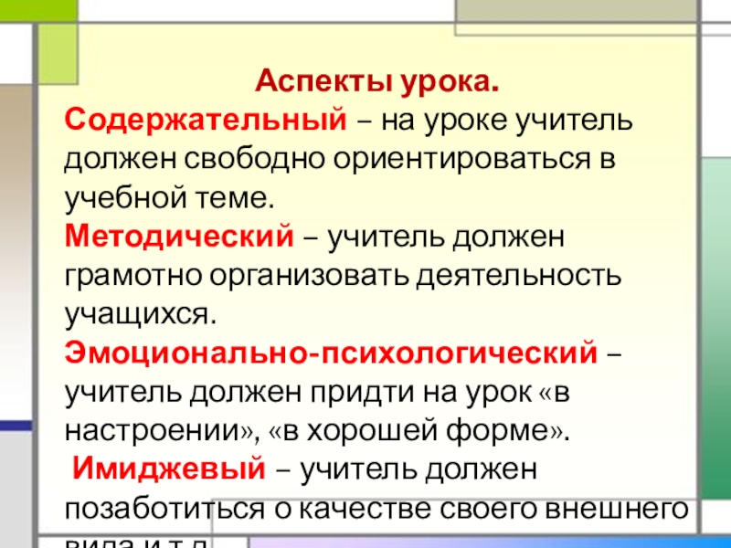 Имиджевый – учитель должен позаботиться о качестве своего внешнего вида и т.д.