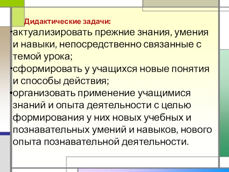 организовать применение учащимися знаний и опыта деятельности с целью формирования у них новых учебных и познавательных умений и навыков, нового опыта познавательной деятельности.