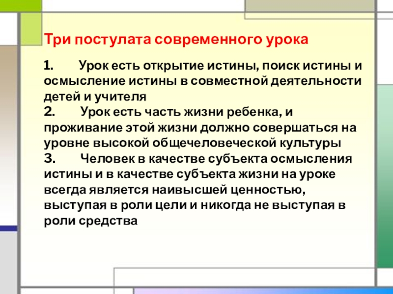 3. Человек в качестве субъекта осмысления истины и в качестве субъекта жизни на уроке всегда является наивысшей ценностью, выступая в роли цели и никогда не выступая в роли средства