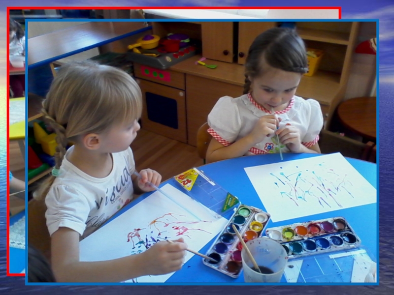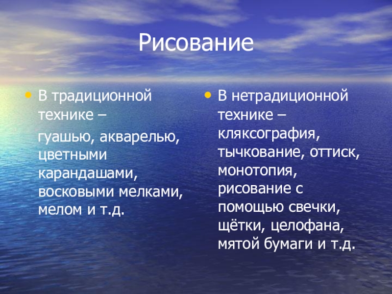 В нетрадиционной технике – кляксография, тычкование, оттиск, монотопия, рисование с помощью свечки, щётки, целофана, мятой бумаги и т.д.