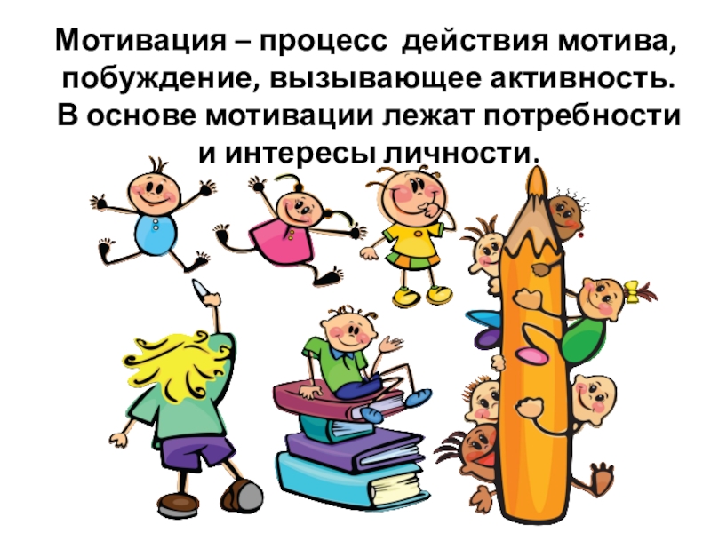 Слайд 9 Мотивация – процесс действия мотива, побуждение, вызывающее активность. В