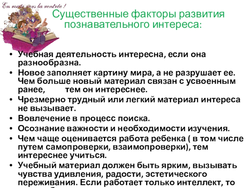 Слайд 8 Существенные факторы развития познавательного интереса: