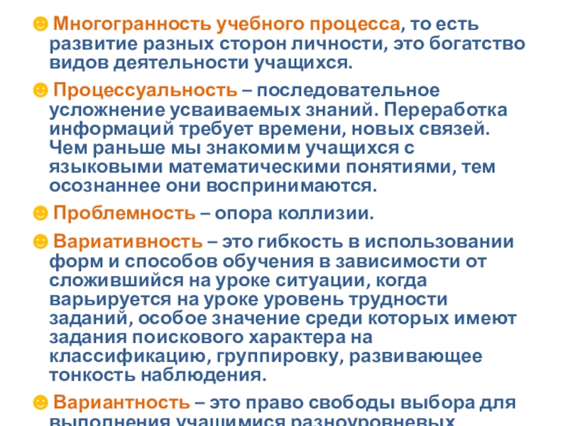 ☻Процессуальность – последовательное усложнение усваиваемых знаний. Переработка информаций требует времени, новых связей. Чем раньше мы знакомим учащихся с языковыми математическими понятиями, тем осознаннее они воспринимаются.