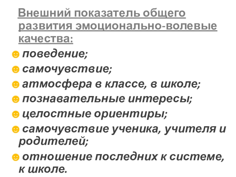 Слайд 4 Внешний показатель общего развития эмоционально-волевые качества: