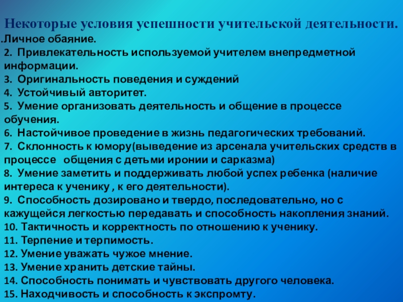 9. Способность дозировано и твердо, последовательно, но с кажущейся легкостью передавать и способность накопления знаний.