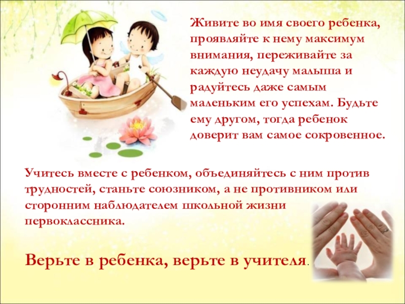 Учитесь вместе с ребенком, объединяйтесь с ним против трудностей, станьте союзником, а не противником или сторонним наблюдателем школьной жизни первоклассника.