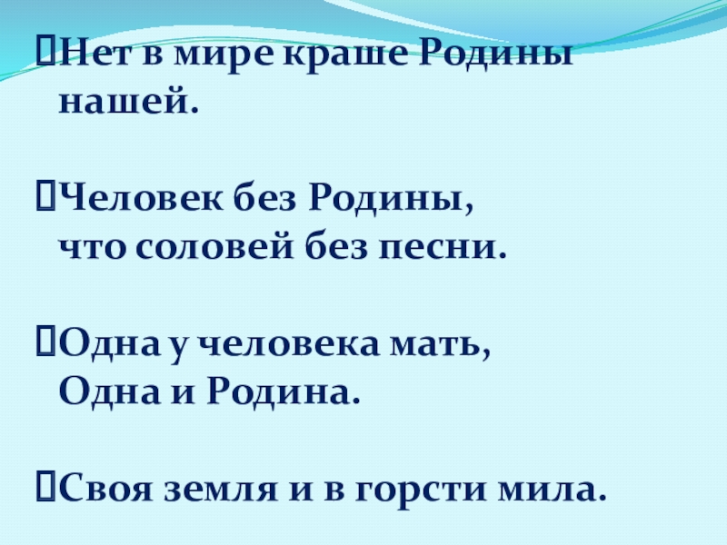 Нет в мире краше Родины нашей.Человек без Родины, что соловей без песни.Одна у человека мать,Одна и Родина.Своя