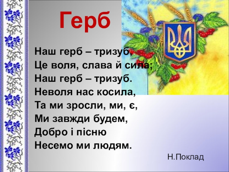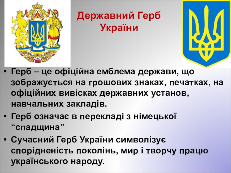 Сучасний Герб України символізує спорідненість поколінь, мир і творчу працю українського народу.
