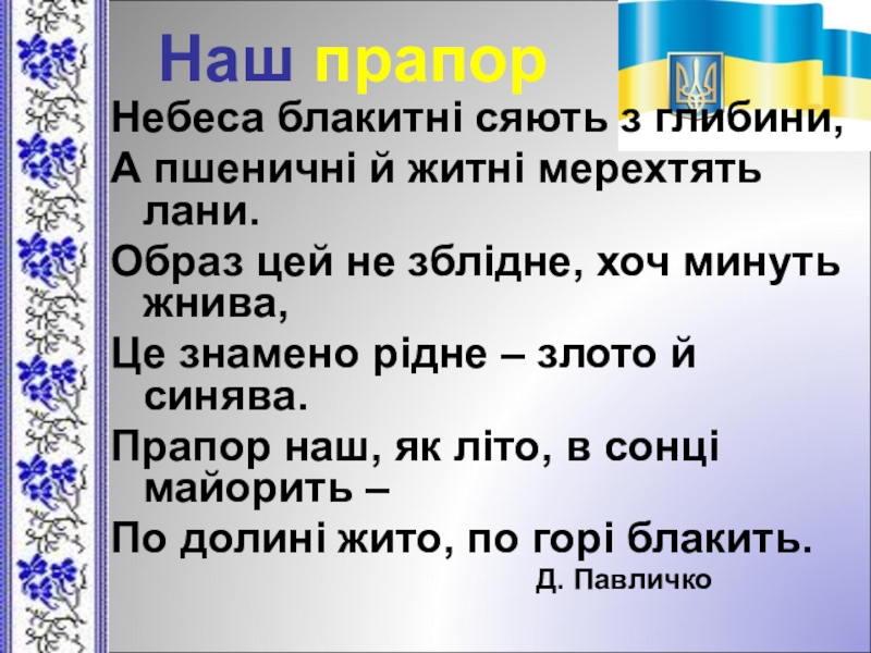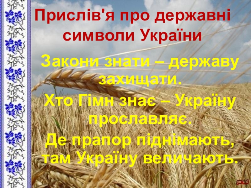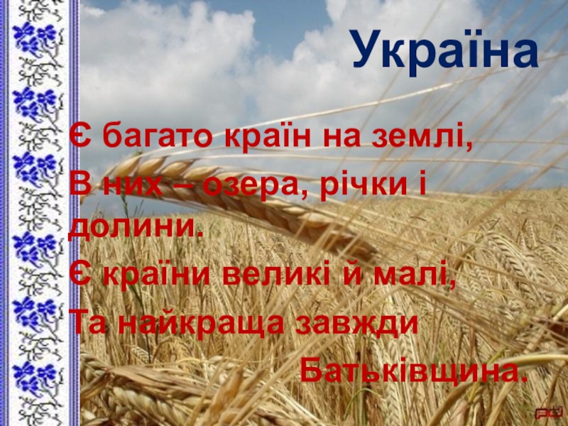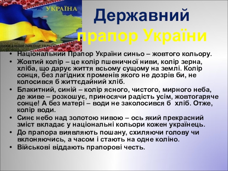 Блакитний, синій – колір ясного, чистого, мирного неба, де живе – розкошує, приносячи радість усім, жовтогаряче сонце! А без матері – води не заколосився б хліб. Отже, колір води.