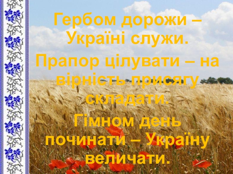 – це колір пшеничної ниви, колір зерна, хліба, що дарує життя всьому сущому на землі. Колір сонця, без лагідних променів якого не дозрів би, не колосився б життєдайний хліб.