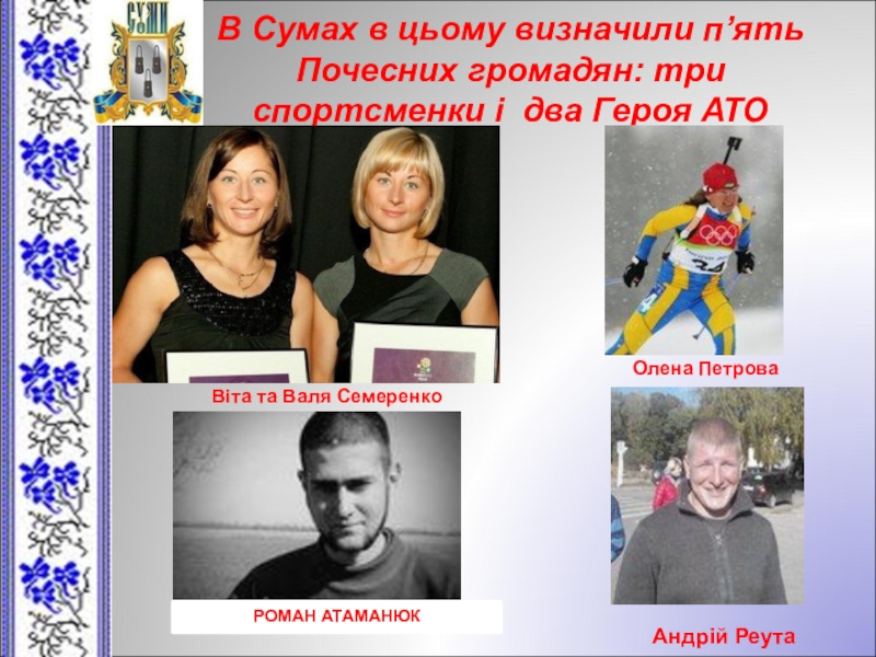 Слайд 28В Сумах в цьому визначили п’ять Почесних громадян: три спортсменки і