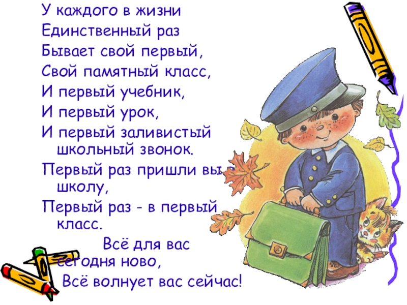 У каждого в жизниЕдинственный разБывает свой первый,Свой памятный класс,И первый учебник,И первый урок,И первый заливистый школьный звонок.Первый раз пришли вы в школу,Первый раз - в первый класс. Всё для вас сегодня ново, Всё волнует