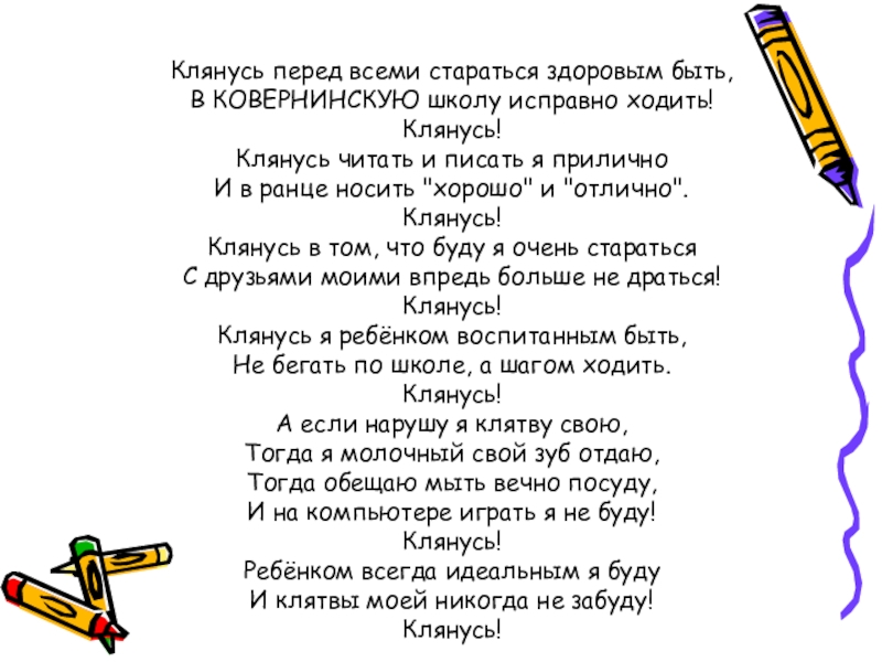 Клянусь перед всеми стараться здоровым быть, В КОВЕРНИНСКУЮ школу исправно ходить! Клянусь! Клянусь читать и писать я