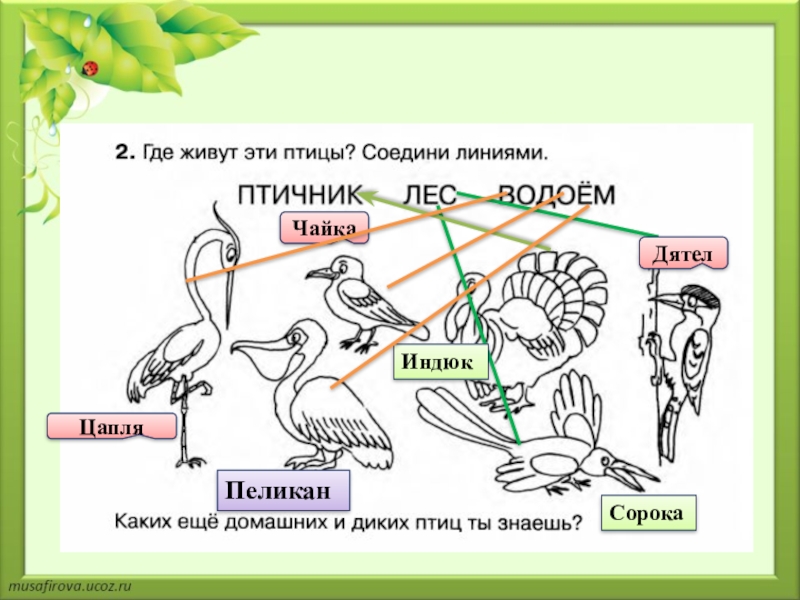 ЦапляЧайкаПеликанСорокаДятелИндюк