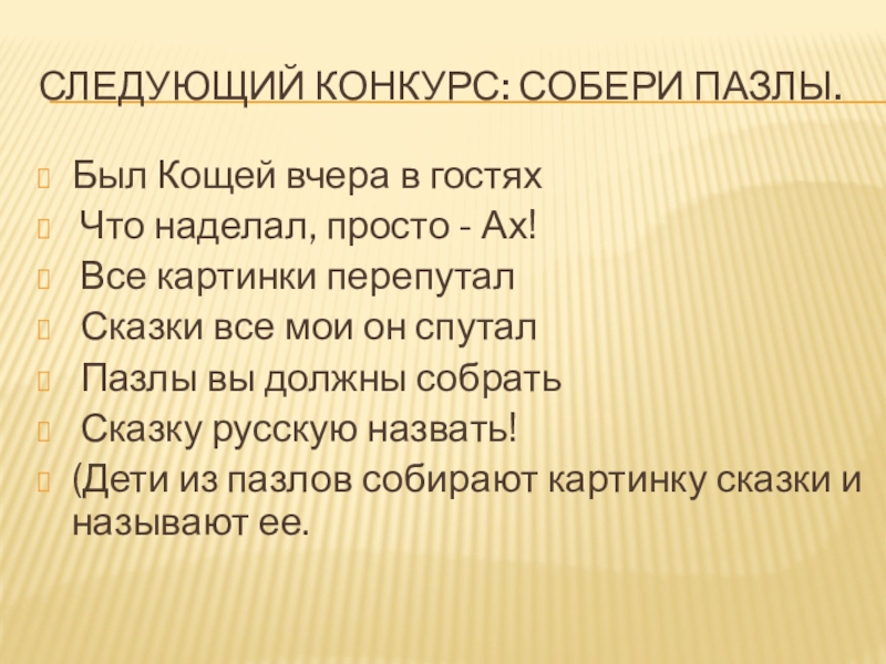 Учить узнавать сказку по заданию.