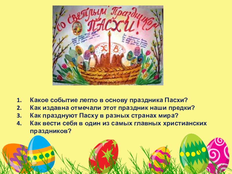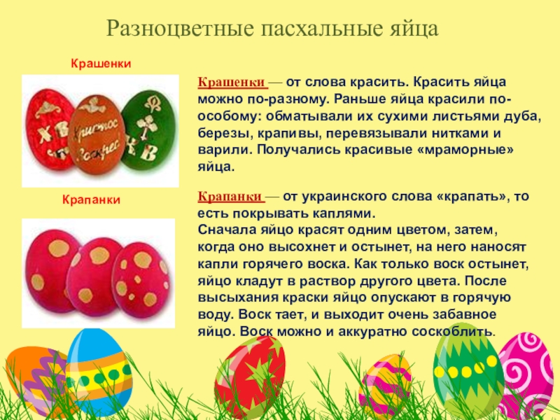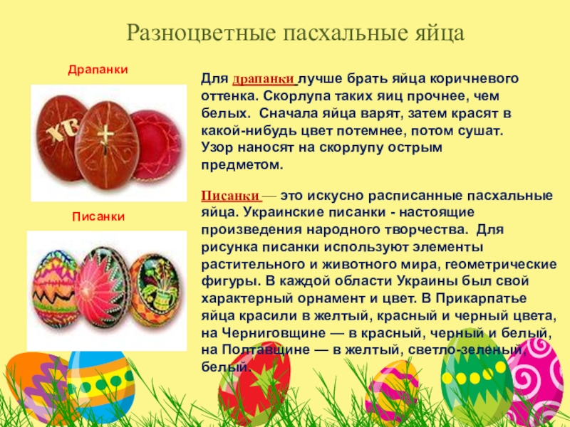 Писанки — это искусно расписанные пасхальные яйца. Украинские писанки - настоящие произведения народного творчества. Для рисунка писанки используют элементы растительного и животного мира, геометрические фигуры. В каждой области Украины был свой характерный орнамент и цвет. В Прикарпатье яйца красили в желтый, красный и черный цвета, на Черниговщине — в красный, черный и белый, на Полтавщине — в желтый, светло-зеленый, белый.