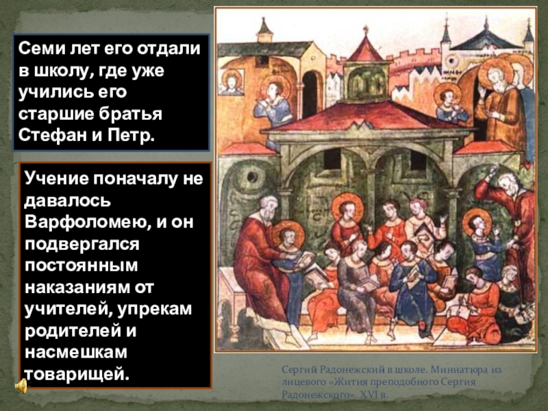 Сергий Радонежский в школе. Миниатюра из лицевого «Жития преподобного Сергия Радонежского». XVI в.