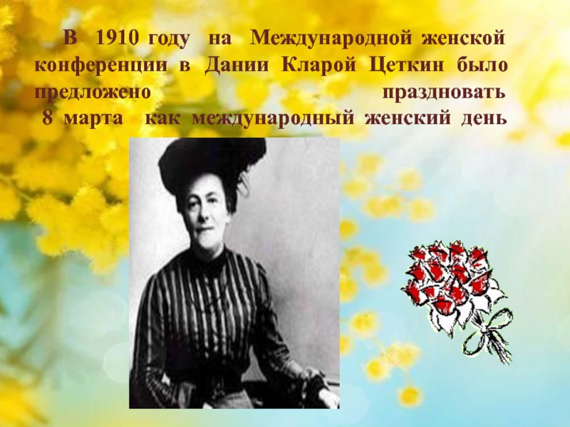 Слайд 13 В 1910 году на Международной женской конференции в Дании Кларой Цеткин