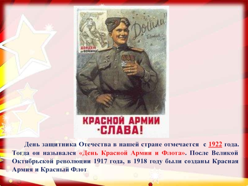 Слайд 5 День защитника Отечества в нашей стране отмечается с 1922 года. Тогда