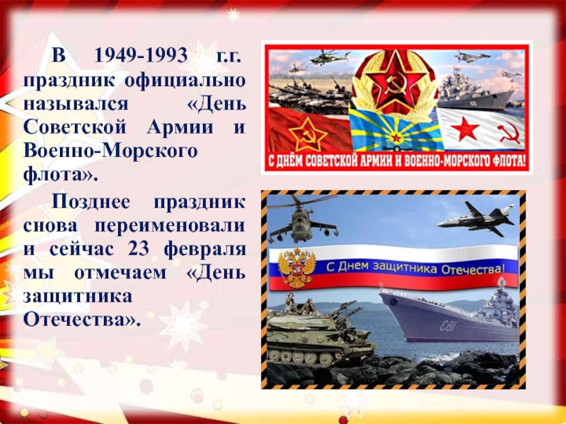 Слайд 7 В 1949-1993 г.г. праздник официально назывался «День Советской Армии и Военно-Морского